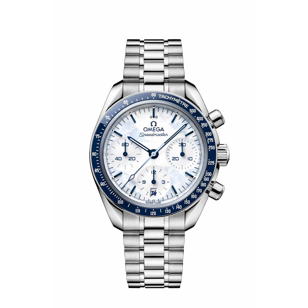 Das Modell zum 90-jährigen Jubiläum von Omega als offiziellem Zeitnehmer verbindet das zeitlose Design der Speedmaster mit einzigartigen Details als Hommage an Milano Cortina 2026. Es symbolisiert Omegas Leidenschaft für Präzision, Innovation und den Sport.