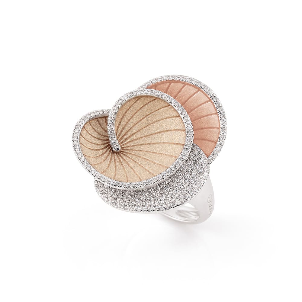 Neben der raffinierten Ausführung mit der Kombination dreier Goldlegierungen (Natural Beige, White Ice Gold und Pink Champagne Gold) ist der Ring auch monochrom in fünf der innovativen, hauseigenen Goldvarianten von Cammilli Firenze erhältlich: White Ice Gold, Pink Champagne Gold, Natural Beige Gold, Black Lava Gold sowie White Ice Gold. Ein pavégefasstes Diamantelement mit insgesamt 0,5 Karat bringt zusätzliches Strahlen ins Spiel und setzt funkelnde Akzente.
