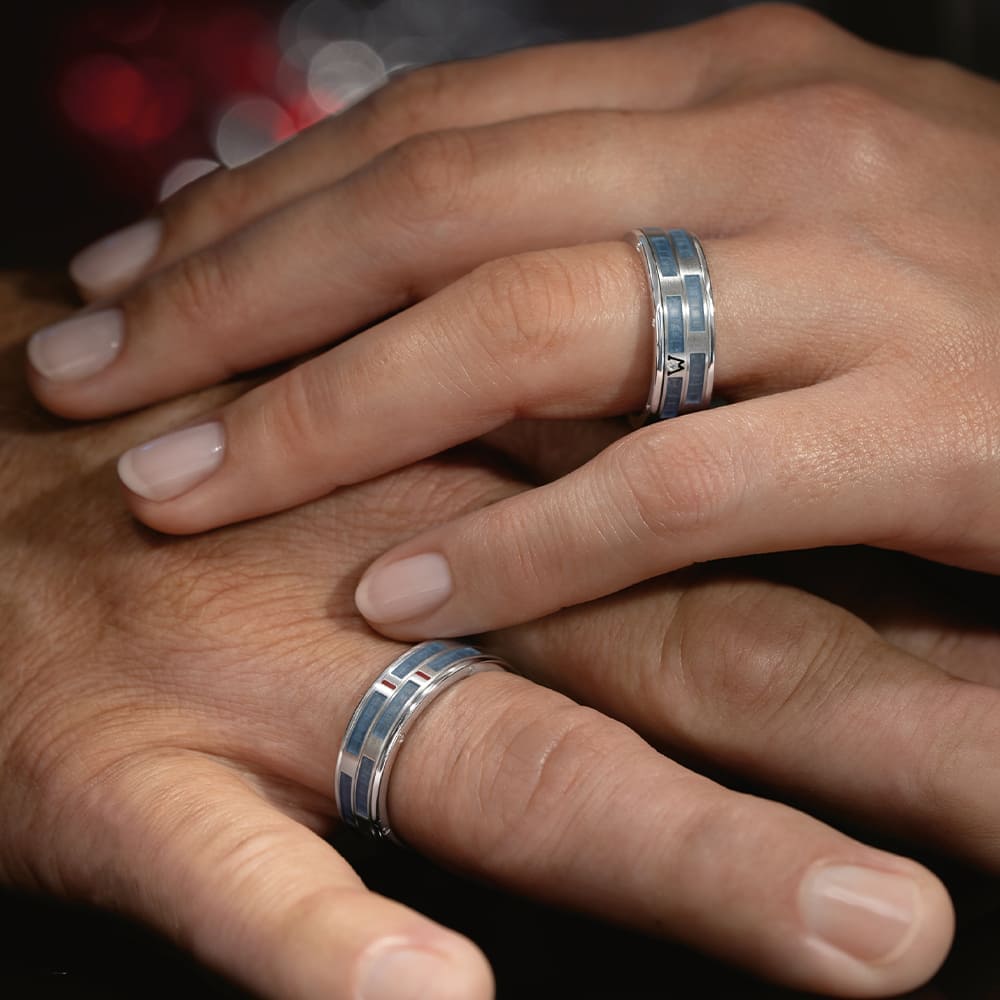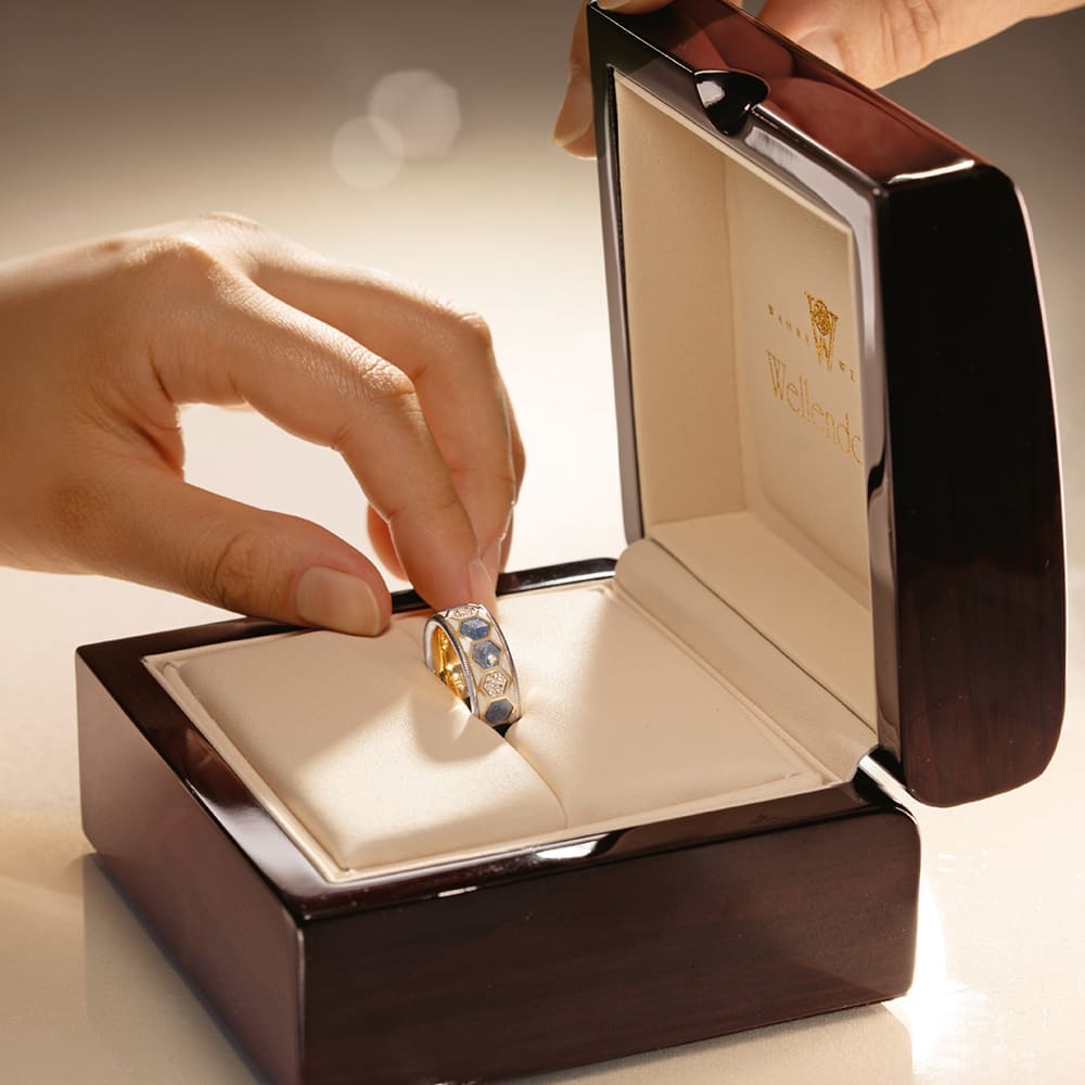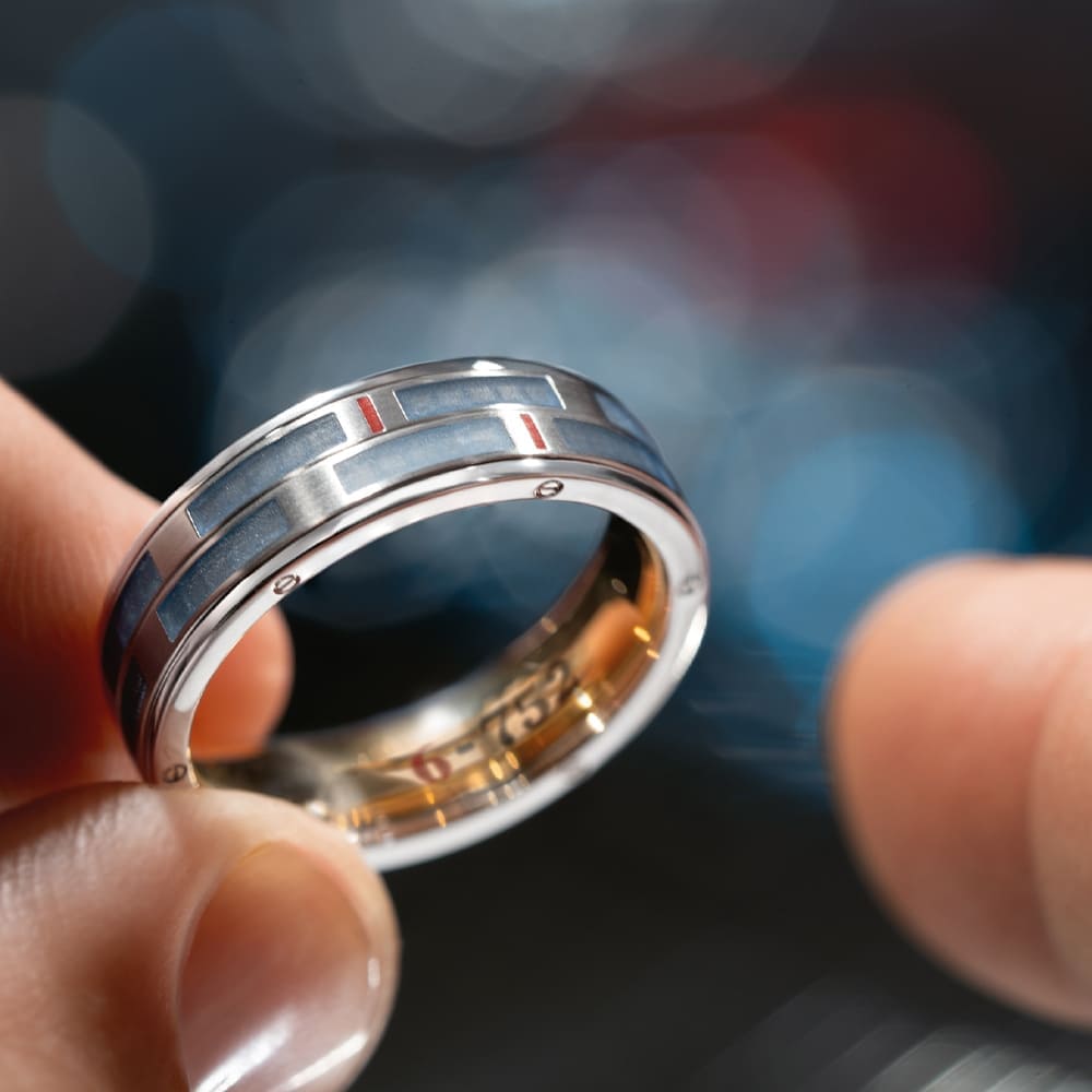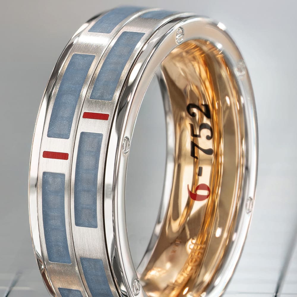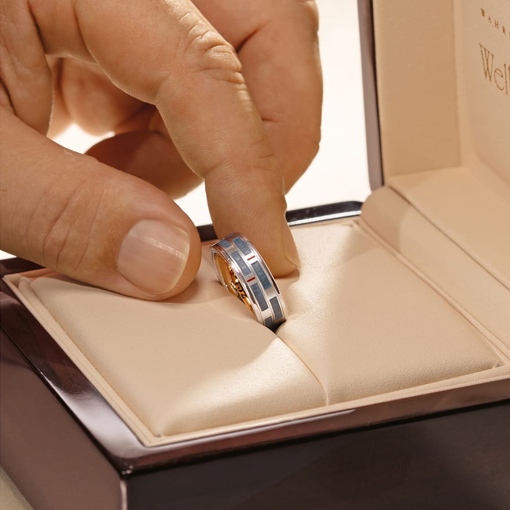 Seinen Namen trägt der Ring im Inneren: Die Zahl „752“ verweist auf die besondere Wellendorff-Überlegierung, bei der stets zwei Teile mehr Feingold verwendet werden als vorgeschrieben. Die „6“ kennzeichnet ihn als sechsten limitierten Männerring der Manufaktur. Unterschiedliche Oberflächen verleihen dem Design Tiefe: Während Innenring und äußere Elemente hochglanzpoliert sind, zeigen sich die drehbaren Ringe seidenmatt. Akzente setzen Kaltemailleflächen in Jeansblau sowie zwei feine Linien in Rot, die dem Ring eine moderne Spannung verleihen.