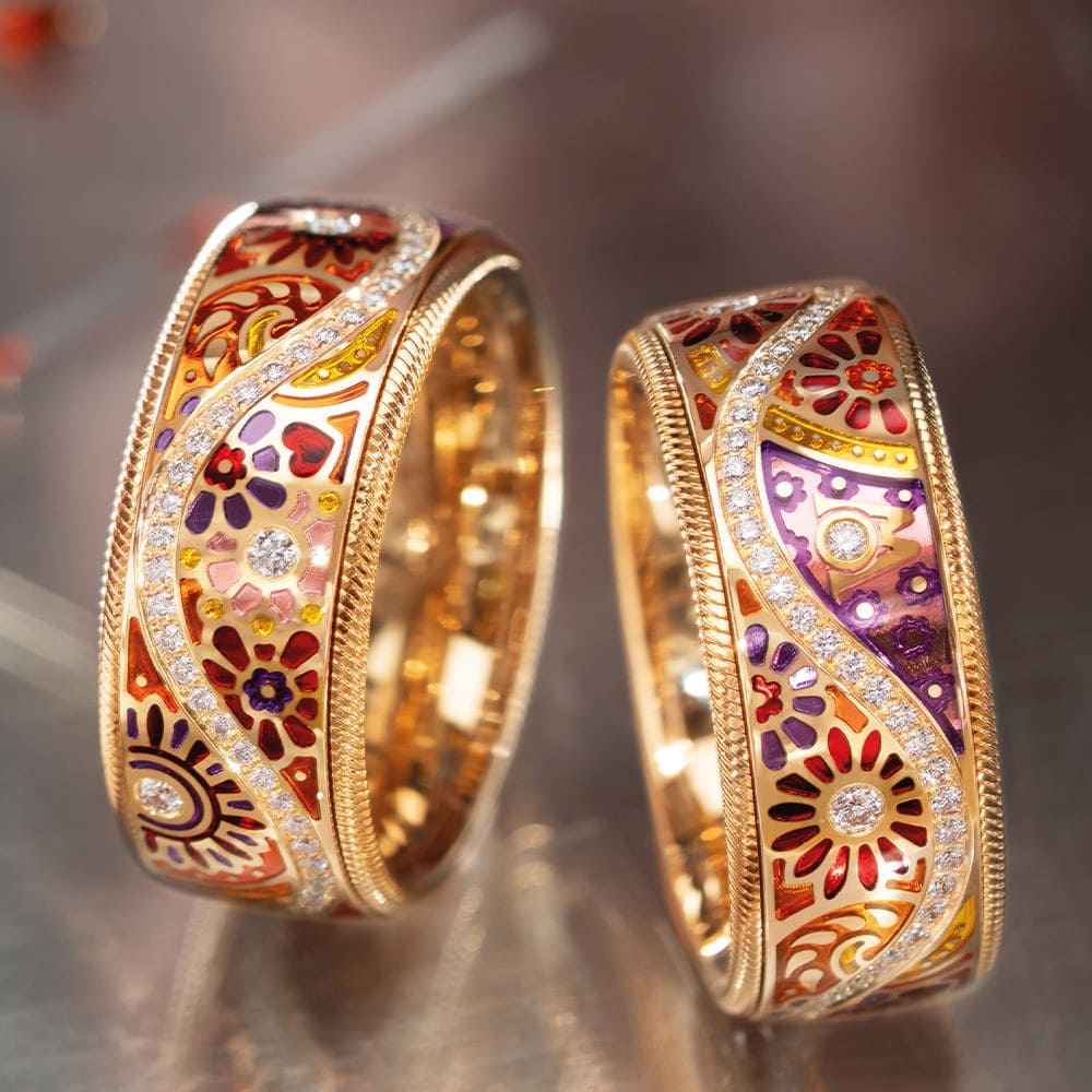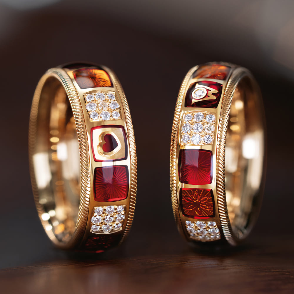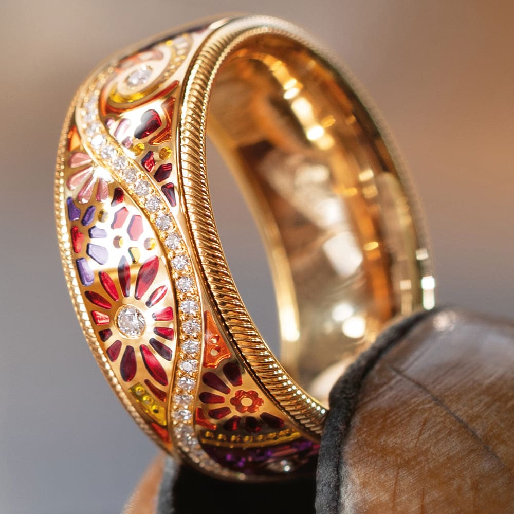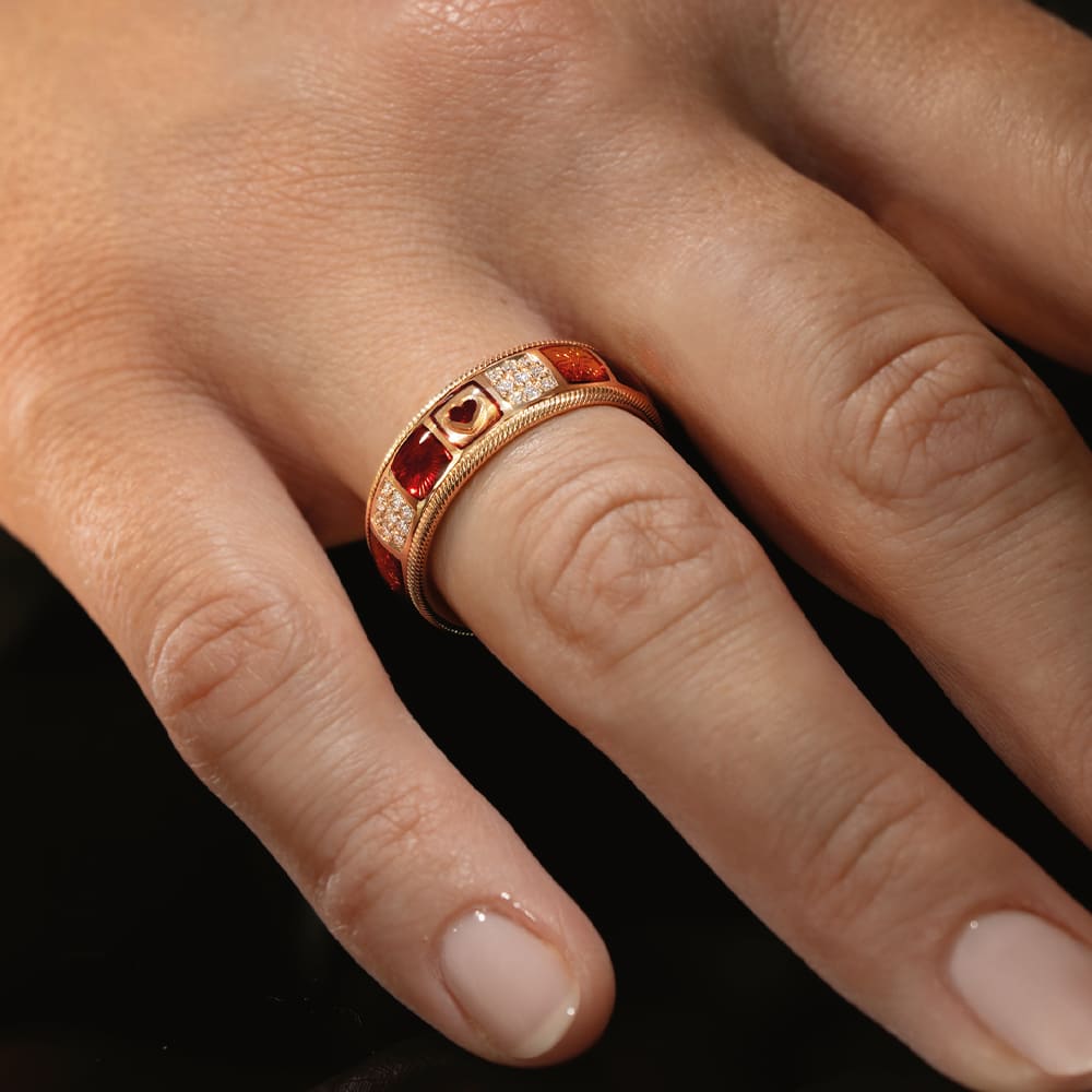 In den hochglanzpolierten Untergrund der Farbmosaike werden reflektierende Ornamente graviert, die das Licht gezielt lenken. Kaltemaille in warmen Rot- und Orangetönen wird in mehreren Schichten aufgetragen und bewusst leicht überhöht, sodass eine sanfte Wölbung entsteht. Florale Motive wechseln sich mit gravierten Sonnen ab. Fünf mit Brillanten besetzte Mosaike bilden funkelnde Akzente, ergänzt durch ein kleines rotes Herz im Zentrum des Rings – ein leises, aber kraftvolles Symbol für das, was wirklich zählt.