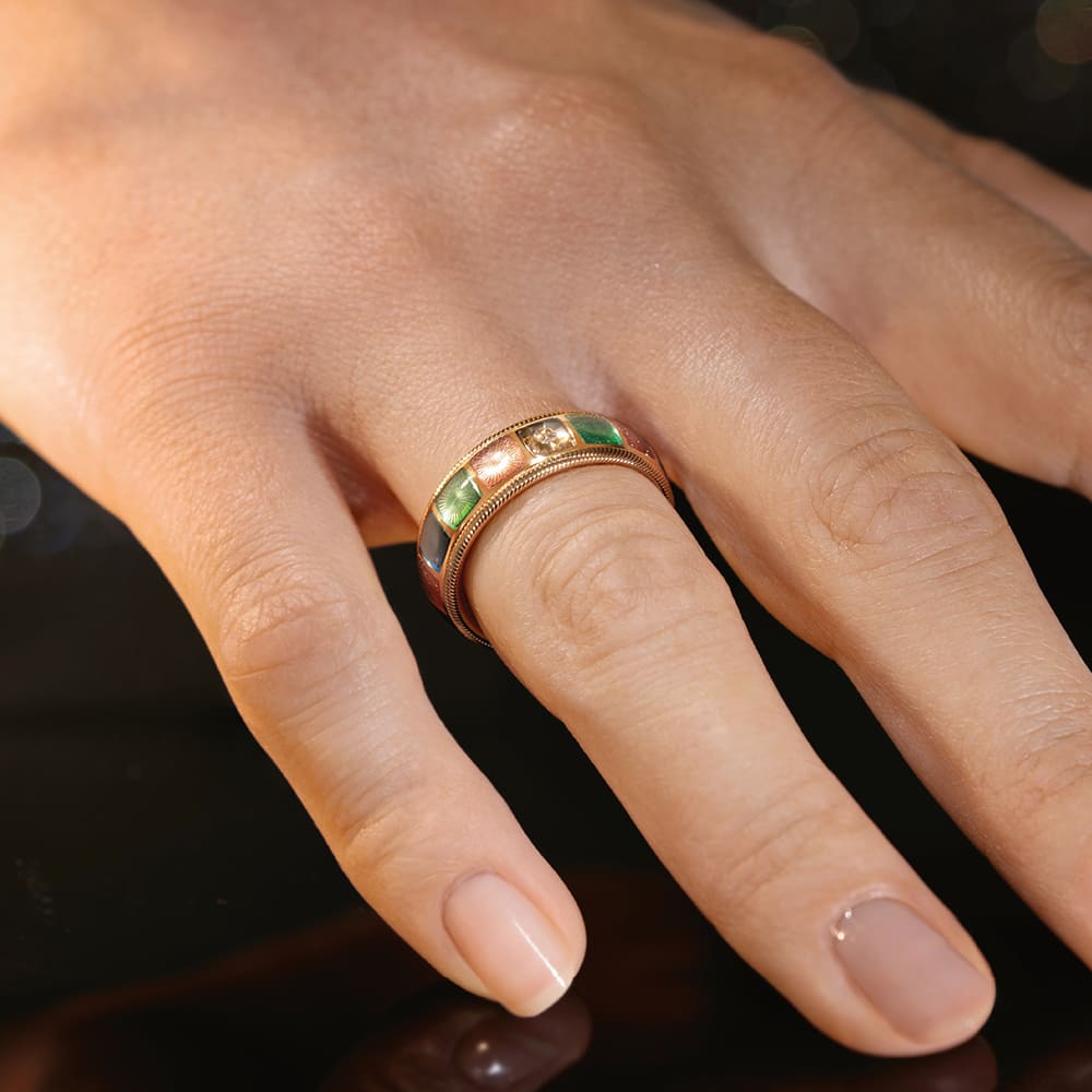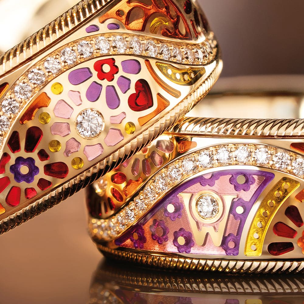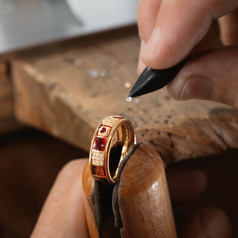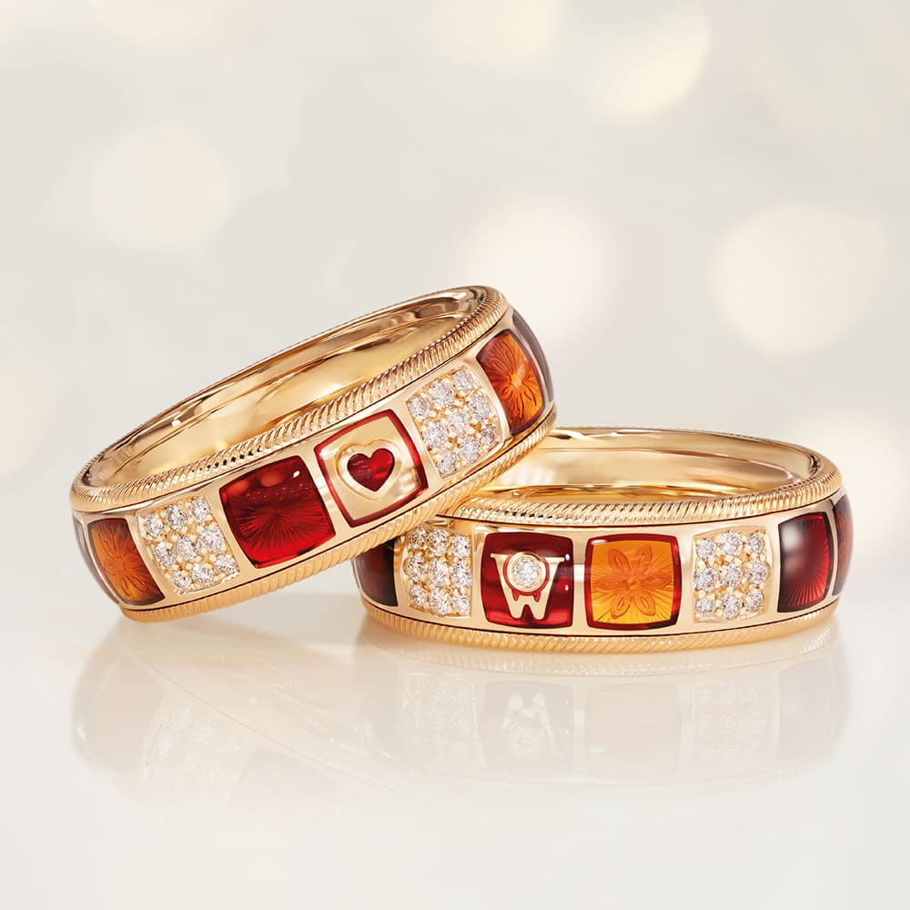 In den hochglanzpolierten Untergrund der Farbmosaike werden reflektierende Ornamente graviert, die das Licht gezielt lenken. Kaltemaille in warmen Rot- und Orangetönen wird in mehreren Schichten aufgetragen und bewusst leicht überhöht, sodass eine sanfte Wölbung entsteht. Florale Motive wechseln sich mit gravierten Sonnen ab. Fünf mit Brillanten besetzte Mosaike bilden funkelnde Akzente, ergänzt durch ein kleines rotes Herz im Zentrum des Rings – ein leises, aber kraftvolles Symbol für das, was wirklich zählt.