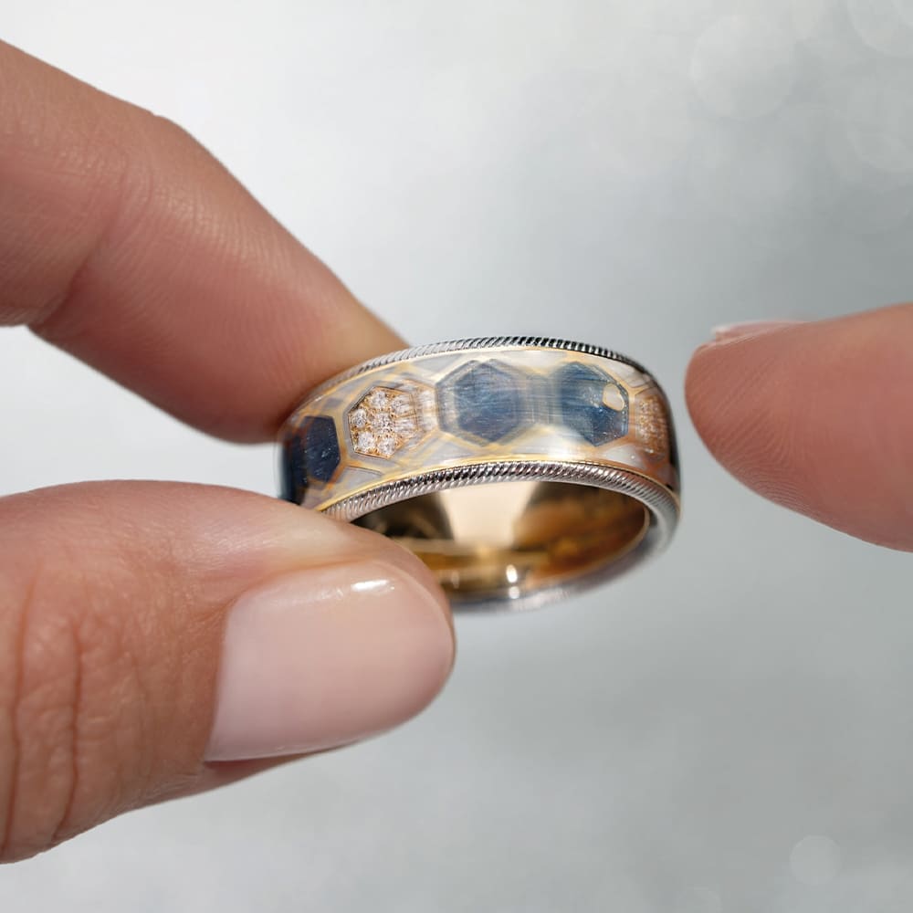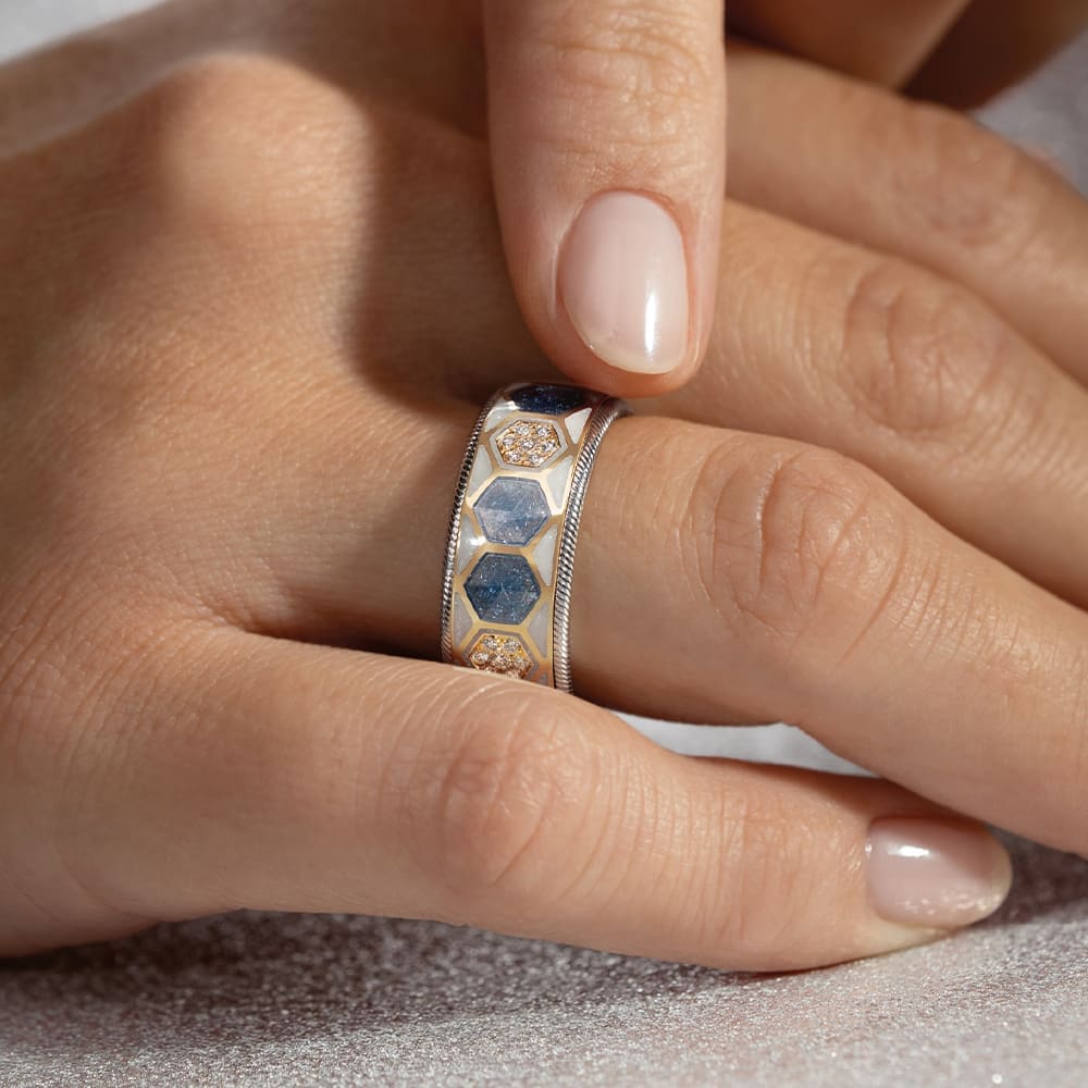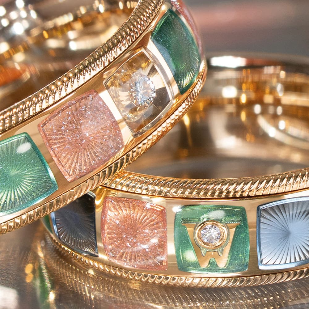 Unterschiedliche Gravurtiefen erzeugen ein lebendiges Spiel aus Licht und Schatten, das zur Mitte hin zusammenläuft. Auf insgesamt 43 Einzelflächen wird die Kaltemaille in mehreren Schichten aufgetragen und teilweise mit feinen Kristallpartikeln veredelt. Dieser sogenannte Sternenstaub sorgt für ein sanftes Funkeln. Vier der Sechsecke sind zusätzlich mit Brillanten besetzt, während zwei Kordelränder aus Weißgold dem Design eine klare Rahmung geben.
