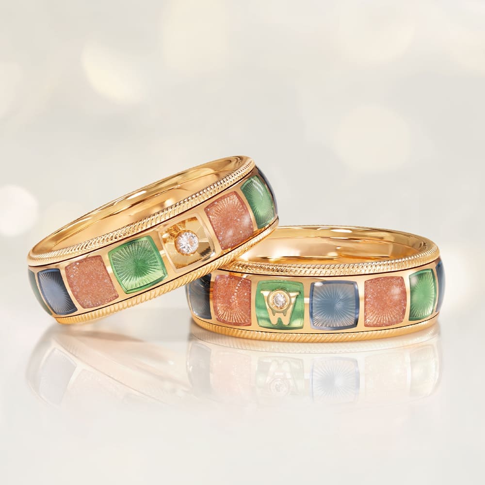 Gestalterisch verbindet der Ring 18-karätiges Gelbgold mit Kaltemailleflächen in Rosa, Mintgrün und Hellblau. Eine neu entwickelte Untergrundgravur sorgt dafür, dass die Farben von innen heraus leuchten. Feine Ornamente im hochglanzpolierten Gold reflektieren das Licht, während unterschiedliche Gravurhöhen der Kaltemaille Tiefe verleihen. Die leicht gewölbte Oberfläche erzeugt einen Linseneffekt. In jedem Farbfeld erscheint eine gravierte Sonne, im Zentrum schwebt ein einzelner Brillant – als stilles Zeichen für den richtigen Moment.