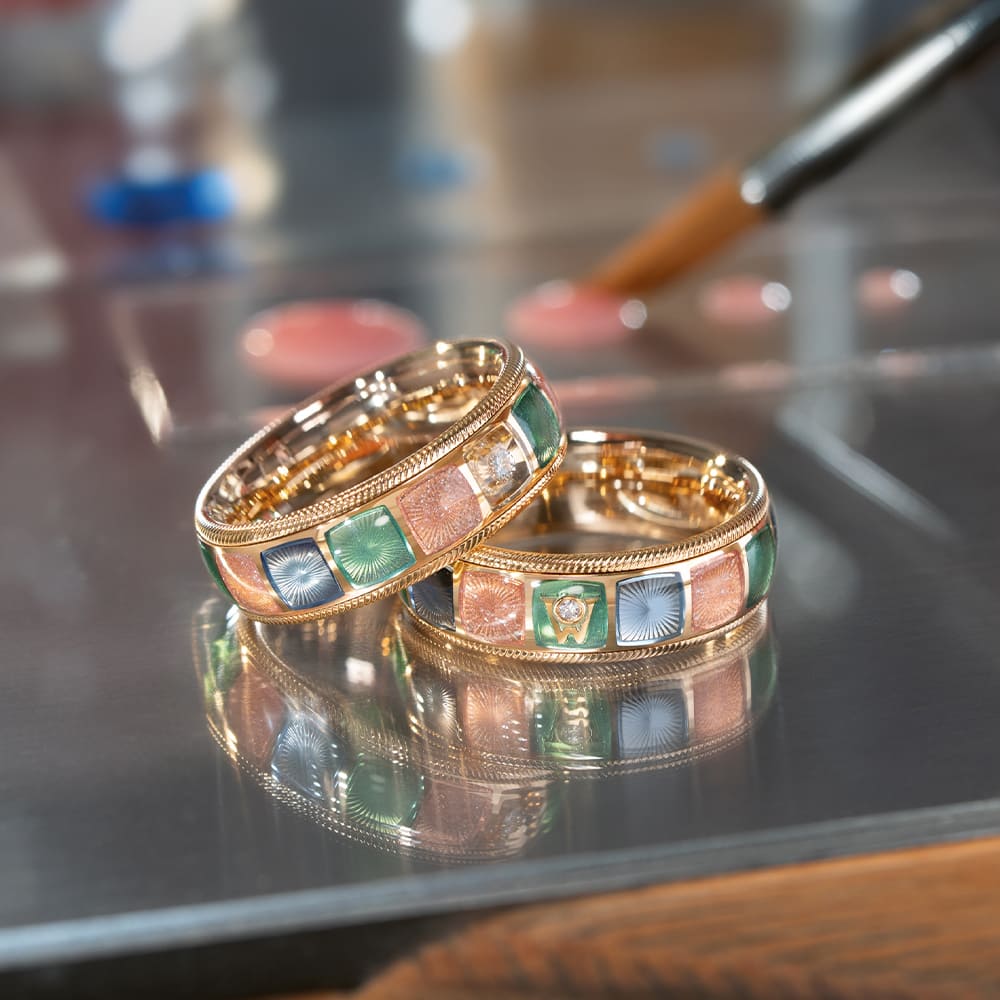 Die Oberfläche ist geprägt von organischen Gravuren, die in mehreren Ebenen ausgearbeitet werden. Leuchtende Kaltemaille in Gelb-, Orange-, Rot-, Rosa- sowie Lilatönen füllt die Strukturen und verleiht dem Ring seine lebendige Tiefe. Unterschiedliche Gravurhöhen lassen einzelne Goldelemente nahezu schwebend wirken. Ein fein graviertes Herz sowie eine geschwungene Linie aus Brillanten ziehen sich harmonisch um den Ring und symbolisieren den Rhythmus des Lebens. Jeder Brillant steht dabei für einen besonderen Moment.