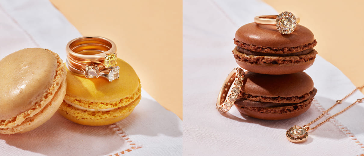 In Ringen, Anhängern und Ohrringen zeigt sich die Form des Kreises diamantbesetzt in den schönsten Goldtönen.