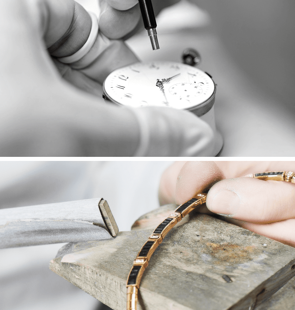 Auch nach dem Kauf sind wir Ihr verlässlicher Partner. In unserer Uhren-Meisterwerkstatt und unserem Goldschmiede-Atelier wird altes Handwerk mit viel Liebe zum Detail gelebt. Kleine Reparatur oder große Revision? Gern beantworten Ihnen unsere Uhrmachermeister alle Fragen rund um exklusive Zeitmesser und gehen mit viel Fingerspitzengefühl zu Werke. Unsere kreativen Goldschmiede entwerfen Unikate nach ihren Wünschen und kümmern sich um die Pflege und Reparatur ihrer kostbaren Schmuckstücke.