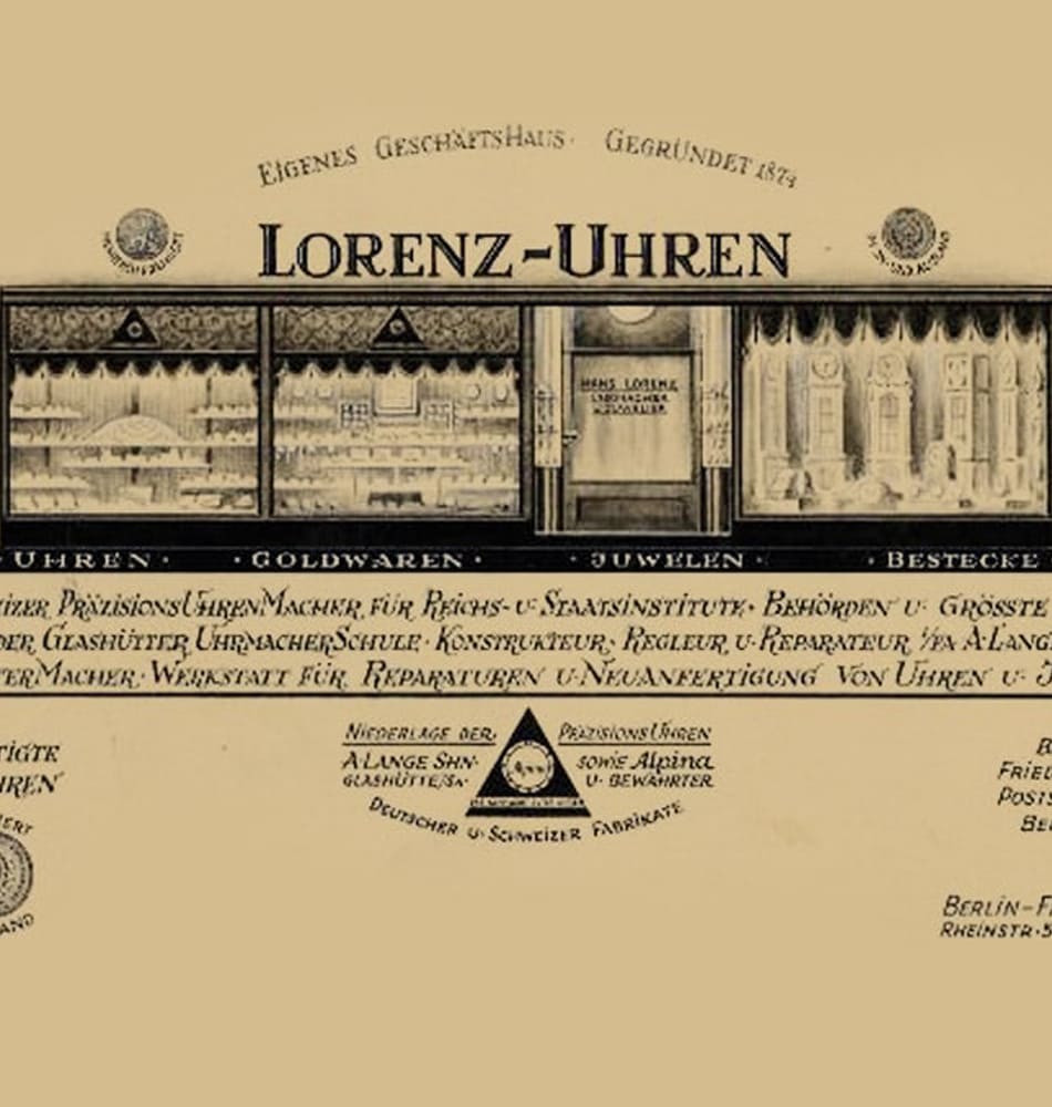 Im April 1874 eröffnet Uhrmacher Löbner seine Werkstatt in Friedenau. Im Dezember übernahm sein Mitarbeiter Reinhard Schulze die Firma und verkaufte fortan auch Uhren und Schmuck. „Nebenberuflich“ war er auch als Standesbeamter in Friedenau tätig. Im Jahr 1887 stellte er seinen Neffen, den Uhrmachergesellen Hans Lorenz ein.