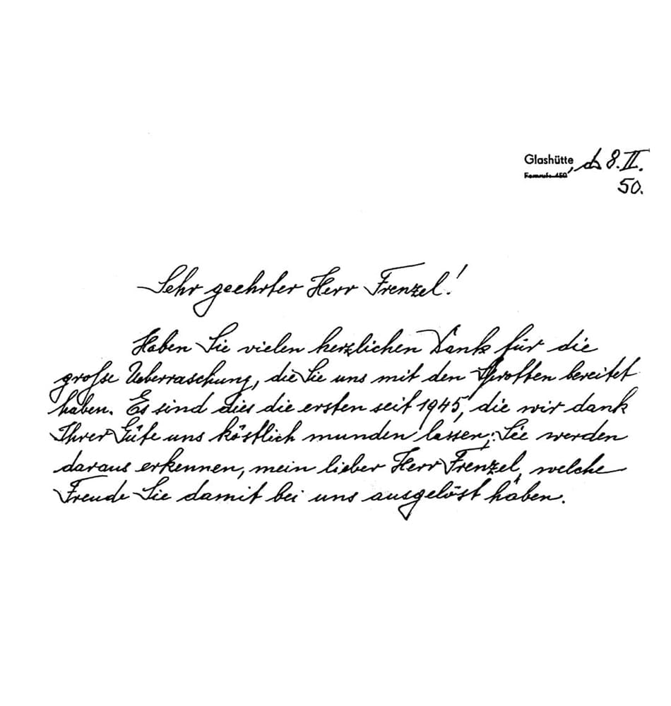 Sprotten waren früher völlig wertlos. Ganz anders im Nachkriegsberlin: In der Sowjetzone hatte die Uhrenfamilie Lange alles verloren. Zu Weihnachten 1949 schickte Lorenz aus Friedenau ein besonderes Festpaket mit Kieler Sprotten nach Glashütte. „Die ersten seit 1945“, wie sich Otto Lange brieflich bedankte.