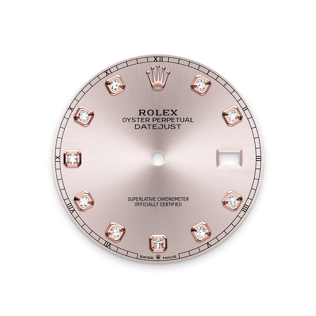 Dieses Zifferblatt verfügt über Diamanten, Fassung 18 Karat Gold. Der Radialschliff lässt zarte Lichtreflexe auf vielen Zifferblättern der Oyster Perpetual Kollektion entstehen. Er umfasst virtuose Bürsttechniken, mit denen Riffelungen erzeugt werden, die von der Mitte des Zifferblatts her ausstrahlen. Licht fließt an jeder Einkerbung entlang und schafft damit einen charakteristischen subtilen Schimmer, der sich mit der Bewegung des Handgelenks verändert. Sobald der Radialschliff abgeschlossen ist, wird die Farbe anhand des PVD-Verfahrens (Physical Vapour Deposition, physikalische Gasphasenabscheidung) oder der Galvanoplastik auf das Zifferblatt aufgetragen. Eine dezente Lackierung verleiht dem Zifferblatt sein vollständiges Erscheinungsbild.