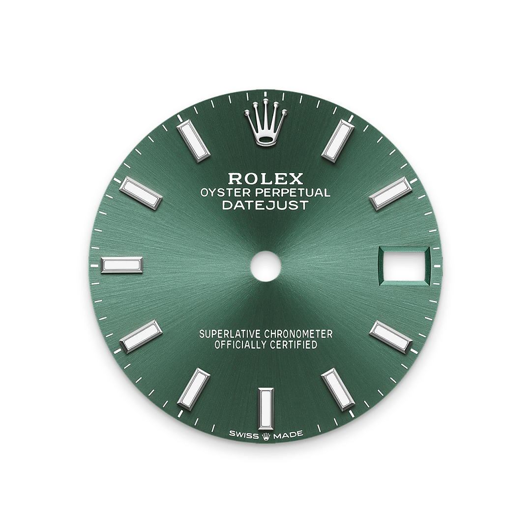 Der Radialschliff lässt zarte Lichtreflexe auf vielen Zifferblättern der Oyster Perpetual Kollektion entstehen. Er umfasst virtuose Bürsttechniken, mit denen Riffelungen erzeugt werden, die von der Mitte des Zifferblatts her ausstrahlen. Licht fließt an jeder Einkerbung entlang und schafft damit einen charakteristischen subtilen Schimmer, der sich mit der Bewegung des Handgelenks verändert. Sobald der Radialschliff abgeschlossen ist, wird die Farbe anhand des PVD-Verfahrens (Physical Vapour Deposition, physikalische Gasphasenabscheidung) oder der Galvanoplastik auf das Zifferblatt aufgetragen. Eine dezente Lackierung verleiht dem Zifferblatt sein vollständiges Erscheinungsbild.